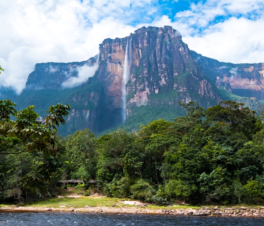 تقع شلالات انجل في فنزويلا، وهي الأكثر ارتفاعاً في العالم (979 متراً) أي هي تعلو شلالات نياجرا 15 ضعفاً في المقارنة. تأتي المياه من نهر تشورون، وتقوم بالسقوط الحر على حافة الجبل في مجموعة من المنحدرات، وصولاً إلى الأسفل. هناك انخفاض ثانٍ بطول 30 مترًا خلف المنحدرات مباشرة.