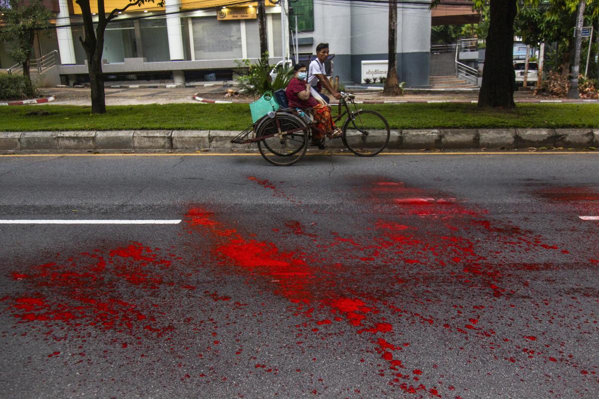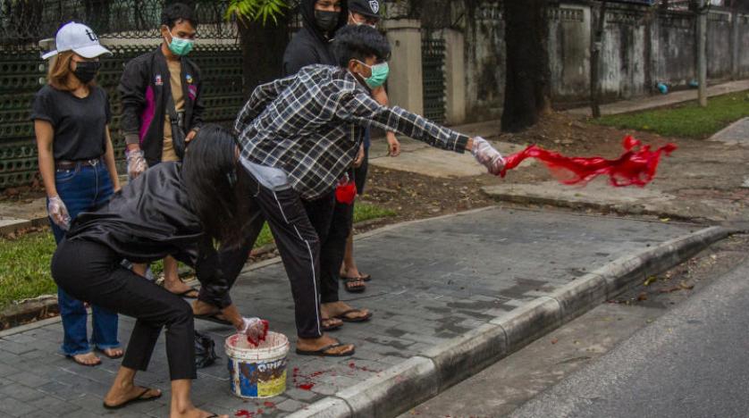 رانغون- رش معارضو المجلس العسكري في ميانمار الطرق بطلاء أحمر في أكبر مدينة بالبلاد الثلاثاء 6-4-2021 إحياء لذكرى مقتل المئات على أيدي قوات الأمن مع استمرار الأزمة وعدم ظهور حل دبلوماسي واضح في الأفق.