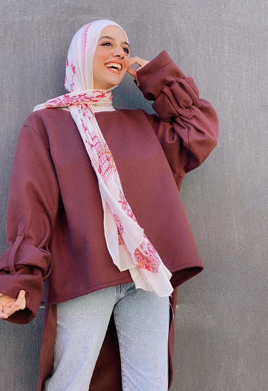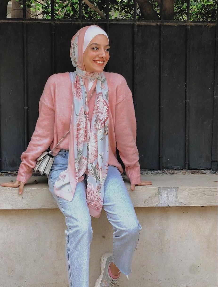 بنطلونات الجينز تُعَدُّ موضة مواكبة لمختلف المواسم، لذا اختارت سمية عادل فستاناً بنفسجياً مصمماً بأزرار بنية وأكمام منفوخة مع حجاب أبيض مطبع بالبنفسجي، وحذاء وحقيبة بأسلوب ناعم، ونسقت في اللوك الثاني بلوزة باللون الأحمر البرغندي مصممة بأكمام واسعة مع حجاب أبيض مزين بطبعات ملونة وبنطلون من الجينز الفاتح.