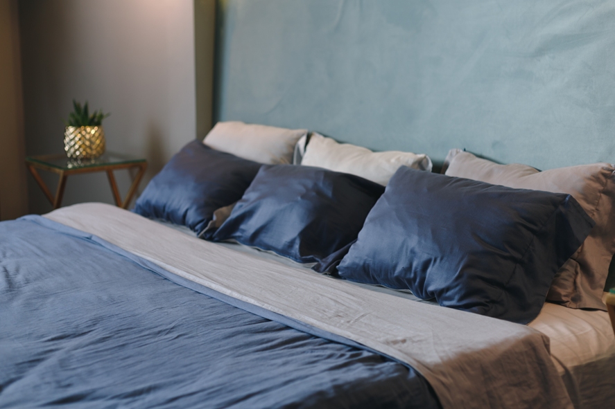 هناك إحساس بالفخامة في هذه المساحة، عند حسن اختيار خاماتها وألوانها الغنية. تضيف وسائد السرير واللمسات الخاصة بعض الألوان الترحيبية، وتتلائم مع نظام الألوان الذي تمليه خلفية غرفة النوم.