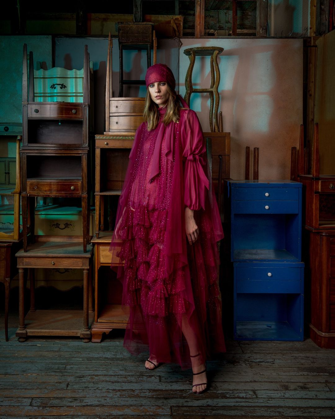 ولتتمتعي بإطلالة أنثوية فريدة يمكنك اعتماد هذا الفستان المميز من توقيع ريم عكرا، والذي يتسم بتصميمه المنسدل والمزين بصيحة الكشكش، والتي أضفت لمسات ناعمة على الفستان بأكمله، كما أن لونه الساحر سيضفي الإشراقة والتوهج على إطلالتك في العيد، خاصة مع الأحجار المتلألئة المرصعة في الفستان والتي تعطي تأثيراً رائعاً عند تعرضها للإضاءة.