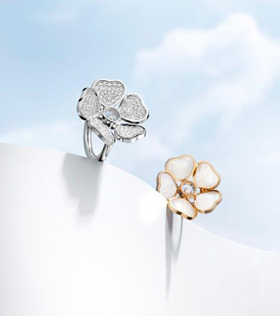 منحت علامة شوبارد مجموعة Happy Hearts الرمزية روحاً جديدة، حيث تتجسد في تصميم مجموعة Happy Hearts Flowers الجديد كلياً، الذي تتفتح فيه خمس تويجات يتخذ كل منها شكل قلب أحمر أو مرصّع بالألماس أو من عروق اللؤلؤ ويتوسطها حجر ألماس متراقص.