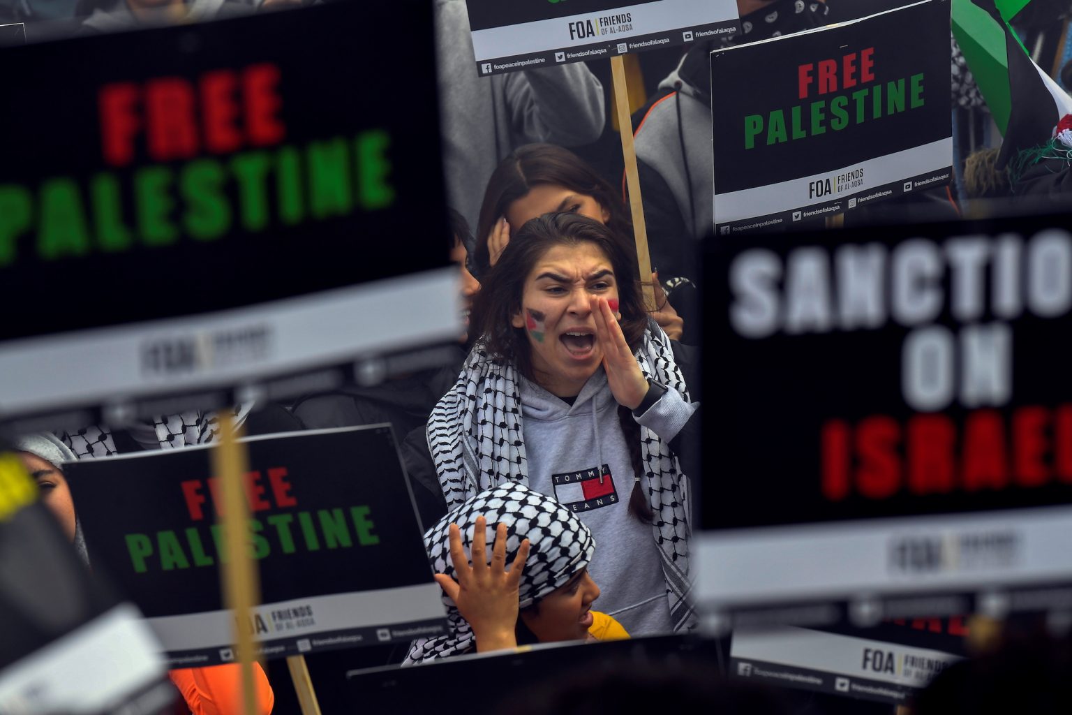 ودعا المحتجون خلال المسيرة في لندن إلى فرض عقوبات على إسرائيل. ولف البعض أجسادهم بالأعلام الفلسطينية وحملوا مشاعل ينطلق منها دخان باللونين الأخضر والأحمر.