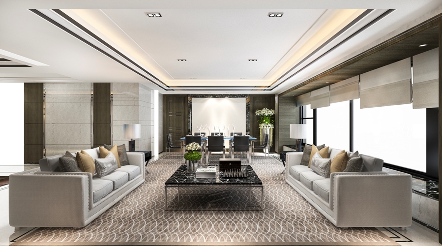في المساحة الكبيرة، يحلو اختيار قطعة ضخمة من السجاد حتى تشي غرفة الجلوس بأنها "اللوبي" في فندق فخم. وفي هذا الإطار، لا يفضل السجاد الوبر لصعوبة تنظيفه، أو السجاد المحمل بألوان عدة، بل قطعة كلاسيكية بألوان الباستيل.