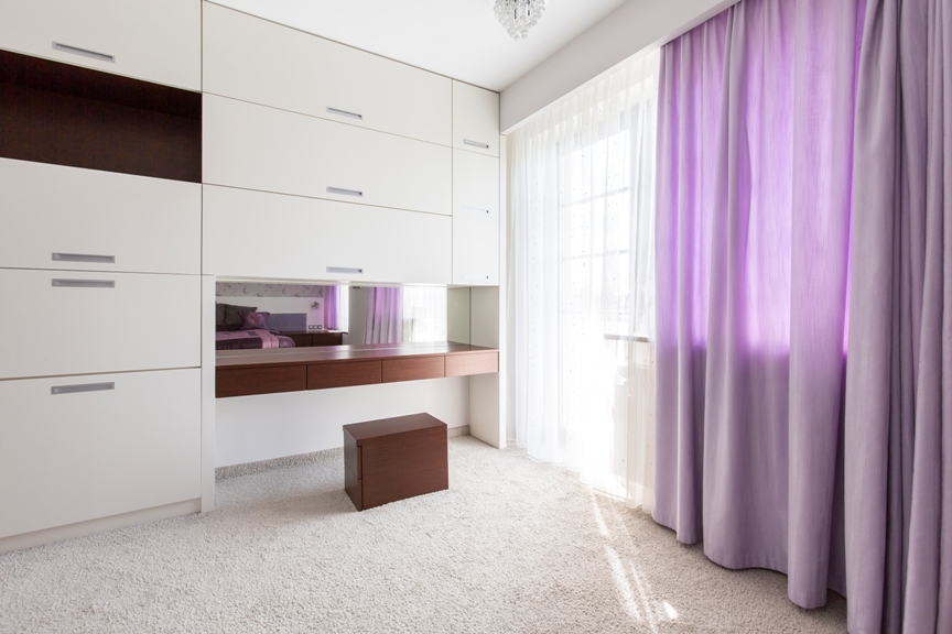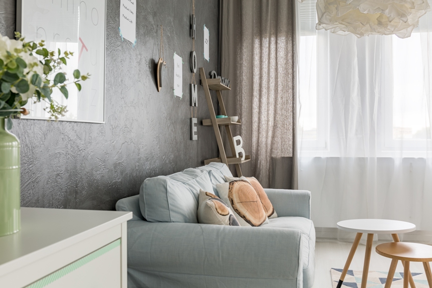 تركب الستارة على كامل النافذة من الشيفون؛ إلى اليمين واليسار في الوسط... في المساحة الأكبر يحضر الشيفون بلون فاتح، وإلى اليمين واليسار يحل قماش "الفوال" الرمادي الداكن مما يعكس تماوجاً في الألوان.