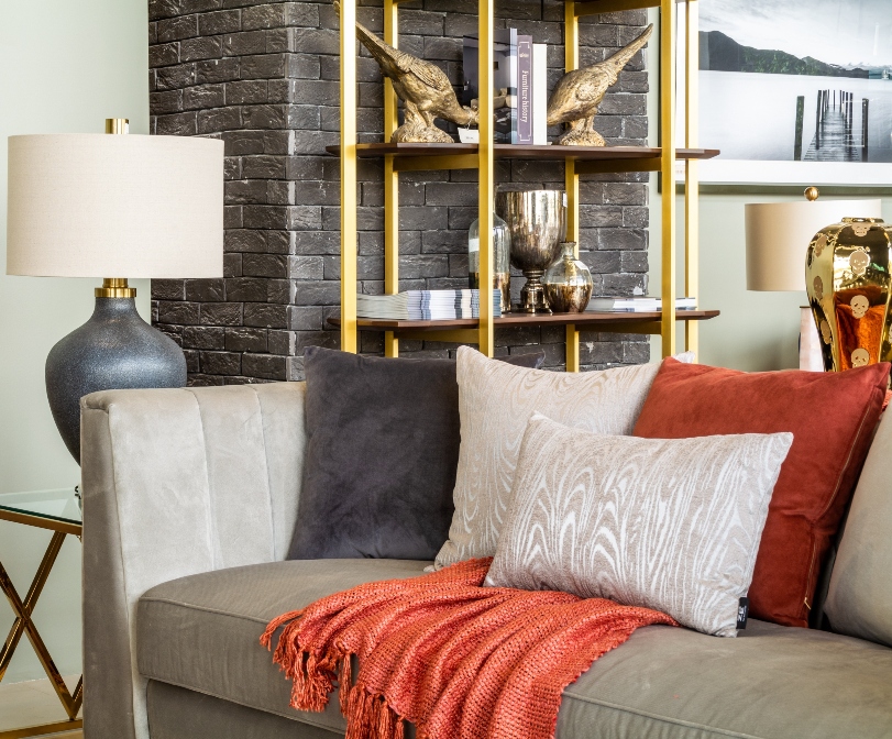 يوظّف اللون الذهبي من خلال تفاصيل الديكور، كالمزهريّة أو وحدة الإضاءة أو المرايا، وذلك حتّى يشي الديكور بالفخامة.