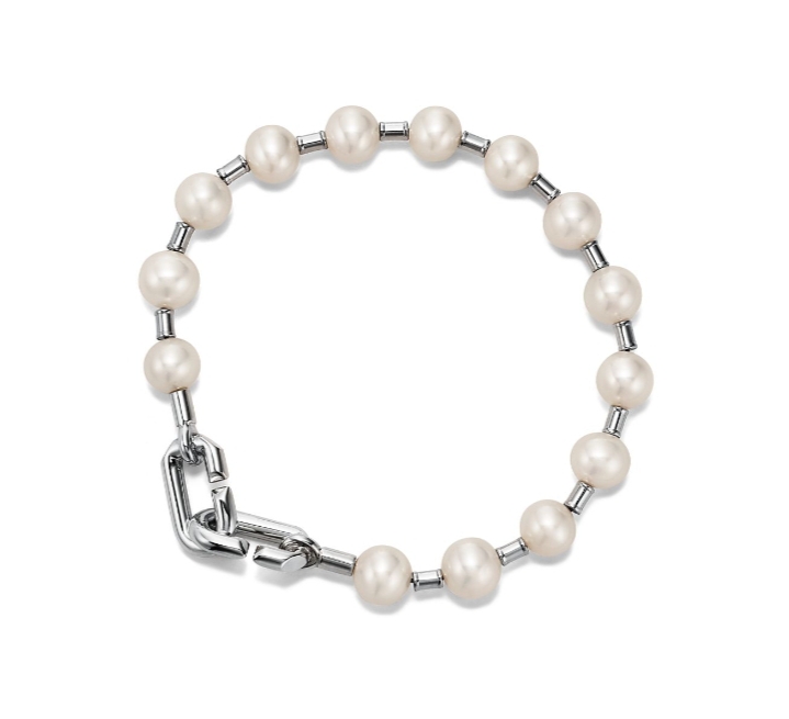 يتميز هذا السوار الفضي الإسترليني من تيفاني أند كو Tiffany & Co بالعصرية والجاذبية المستوحاة من الهندسة والروابط الجريئة مع اللآلئ المكررة، والمُرصع ب ١٤ عرقاً من اللؤلؤ الأبيض المستدير بشكل راقٍ مع إبزيم مشبك المطلي بالفضة.