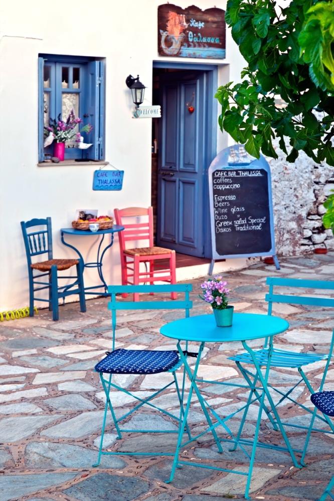 هناك قريتان رئيستان: «سكوبيلوس تاون» و«جلوسا»؛ يتمركز معظم أماكن الطعام والشراب في «سكوبيلوس تاون»، التي تعدّ بقعة الحياة الليلية الرئيسة في الجزيرة، مع الإشارة إلى أن الأطباق البحريّة وتلك المشويّة مُميّزة، كما هي المقاهي القريبة من كورنيش الميناء ومن الشوارع الضيّقة التي تدنو من «المدينة القديمة».