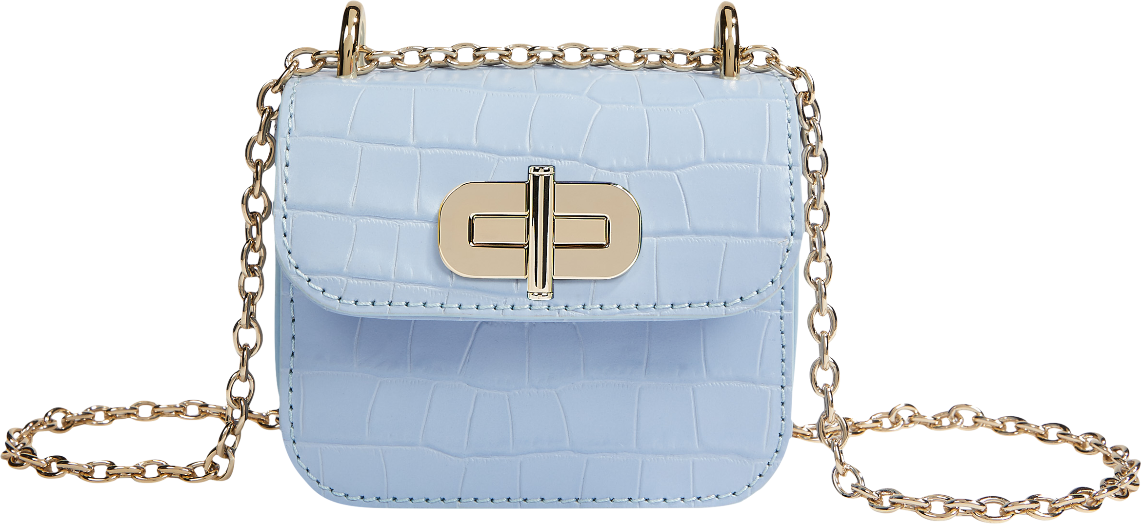 وبالون الأزرق أيضاً إنما بدرجته الفاتحة، اختارت علامة تومي هيلفيغر Tommy Hilfiger أن تقدّم هذا التصميم من الحقائب. فجاءت الحقيبة مصنوعة من جلد التمساح ومرفقة ببكلة وسلسلة معدنية باللون الفضي.