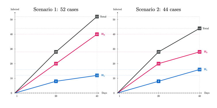 صحيحٌ أن اللقاحات المضادة لمرض كوفيد-19 ليس لها تأثير تحصين فوري لأنها تستغرق تقريبًا 14 يومًا للحصول على نتيجة ملموسة، لكن للتوضيح، سنفترض أنه لا يوجد بطء في فعالية التحصين. وفي السيناريو الأول، نعطي اللقاح للمجموعة إتش 1 فقط، الجرعة الأولى في اليوم الأول، ونعطيهم الجرعة الثانية في اليوم الحادي والعشرين. وفي السيناريو الثاني، نمنح اللقاح لكلا المجموعتين إتش1 وإتش2 ولكننا سنعطيهم جرعة واحدة فحسب.