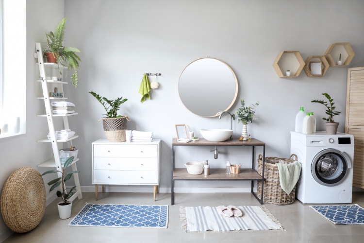 السجادة والبساط الملوّنان يضيفان اللمسة المعاصرة إلى الحمّام، مع حسن التنسيق بينهما والعناصر الأخرى لإطلالة متماسكة في الديكور.