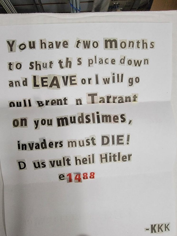 وكانت الرسالة المرسلة إلى المركز الإسلامي عبارة عن ورقة واحدة مع قص الحروف ولصقها مرة أخرى لتشكيل الكلمات.
