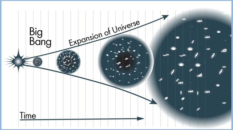 استناداً إلى البحث الذي أجراه إدوين هابل وجورج لومتر وألبرت أينشتاين، وآخرون، تفترض نظرية الانفجار الكبير بداية الكون منذ حوالي 14 مليون عام بانفجار ضخم.