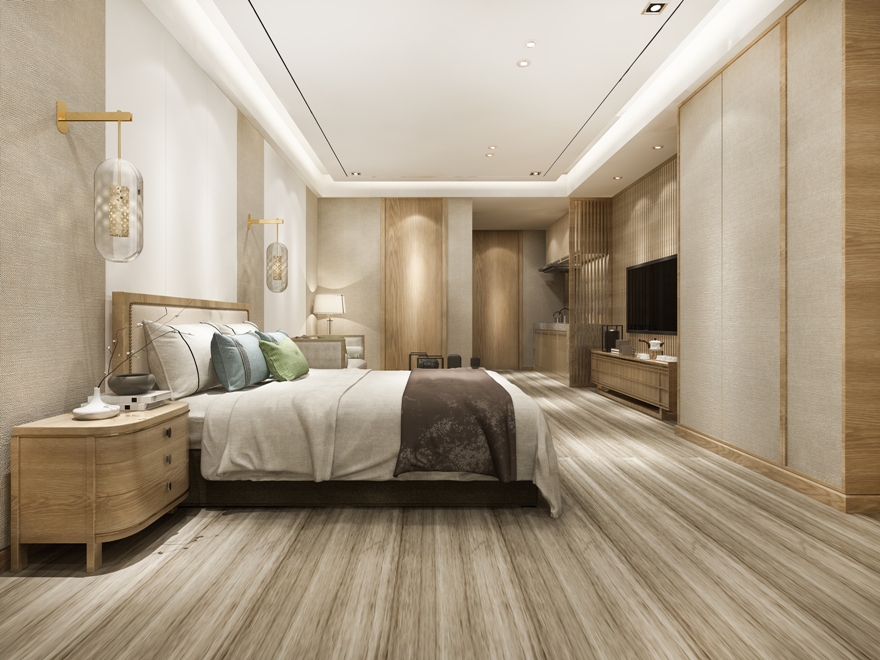 يمكن اختيار الخزانة الضخمة الممتدة على كامل الجدار والملونة بلون الخشب الفاتح أو أي لون حيادي، بغض النظر عن مساحة الغرفة، مما يوحي بالمينيمالية.