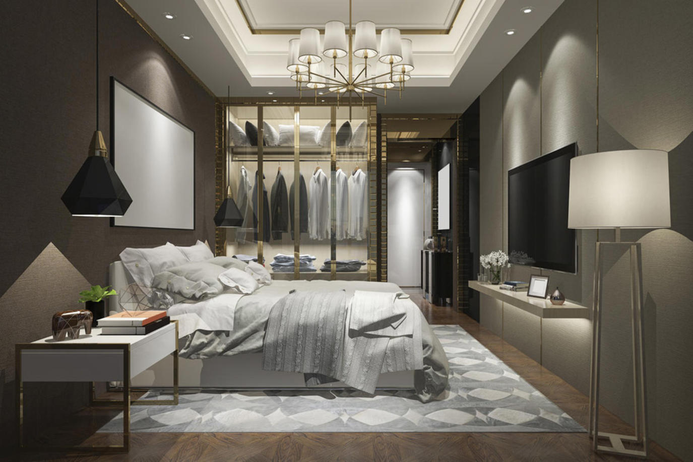 إن التصاميم الصناعية رائجة هذا العام، لذا تبدو أبواب خزائن الملابس معدّة من الحديد الداكن ومكسوة بواجهات من الزجاج المعتق الذي يسمح برؤية الأغراض في داخل الخزانة، مع التركيز على الإنارة المخفية.