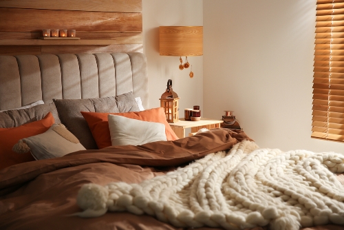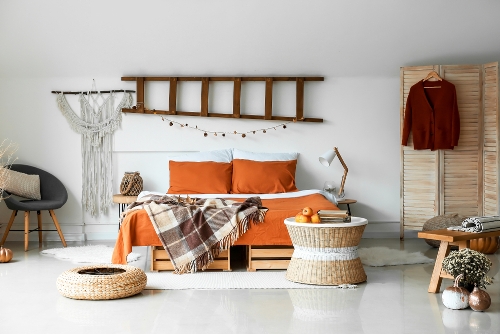 لطلّة خريفيّة بارزة، يمكن اختيار ملاءات السرير من الكتّان بلون الفانيليا، والبطّانية المحبوكة أو رمي قطعة من الفرو عليه. إلى ذلك، يكفي وضع مشلح برتقالي على سرير أبيض لعكس الجوّ المرغوب.