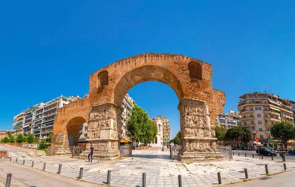 ربما يكون قوس غاليريوس هو الهيكل الروماني الأكثر تميزاً في سالونيك. إنه أيضاً واحداً من أشهر مناطق الجذب في سالونيك جنباً إلى جنب مع البرج الأبيض. تم تكليف القوس كنصب تذكاري من قبل الإمبراطور غاليريوس للاحتفال بالحملة المنتصرة ضد الفرس الساسانيين في عام 298 م والاستيلاء على عاصمتهم قطسيفون. كان للقوس في شكله الأولي أربعة أعمدة رئيسية وأربعة أعمدة ثانوية. اليوم، لا تزال قائمتان فقط من الركائز الأساسية وركيزة ثانوية واحدة. لا يزال بإمكان الزوار رؤية تسلسل المعركة المنحوت بشكل جميل على الأعمدة المتبقية من الممر.
