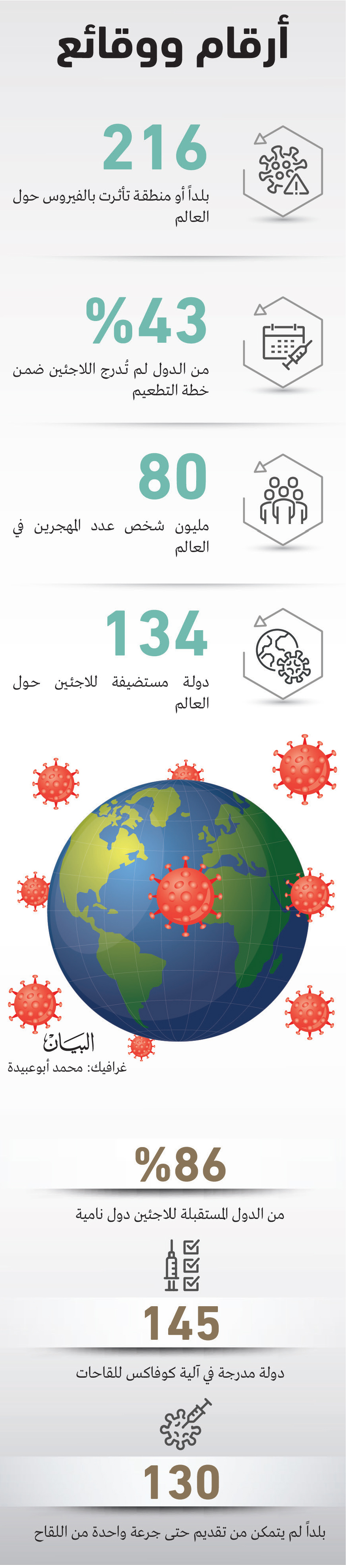 تلك الإحصاءات تعني أن 43 في المئة من الدول التي أعلنت عن استراتيجياتها لم تُدمج اللاجئين ضمن حملات التطعيم وهو مؤشر شديد الخطورة، لاسيما إذا ما تم النظر إلى ما أكده كبير مسؤولي الصحة العامة في المفوضية بشأن ما يمثله استبعاد اللاجئين من خطط التطعيم من خطورة شديدة، وعلى اعتبار أنه «باستخدام منطق الصحة العامة، من المستحيل كسر أو إبطاء انتقال الفيروس بشكل مستدام ما لم يحصل 70 في المئة من السكان على المناعة».