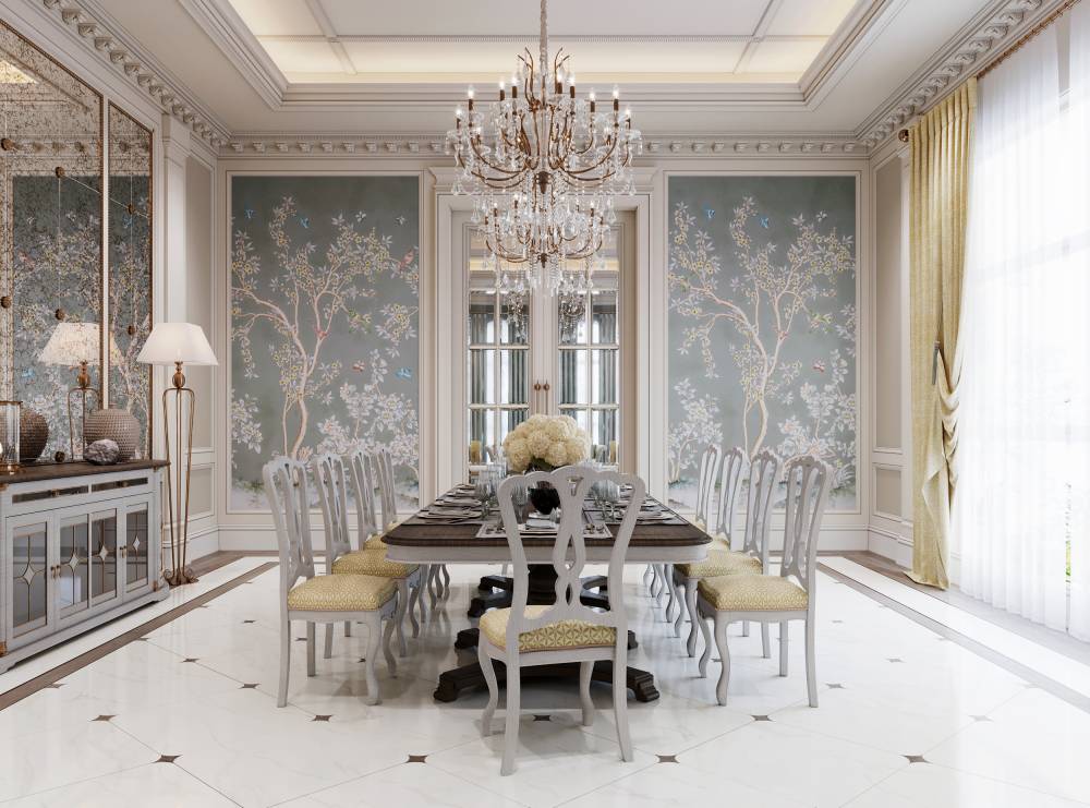 تشدّد المصمّمة على أهمّية الألوان الدافئة والمحايدة في ديكور غرفة الطعام، وتتحدّث عن دورها في تحقيق جوّ دافئ وممتع؛ فالأثاث الخشبي والضوء الطبيعي سيؤثّران إيجاباً في مظهر غرفة الطعام، المظهر الذي يبدو أكثر تناسقاً. السجادة الناعمة، بدورها، تتمّ المشهد. وفي هذا الإطار، يشي حضور الوردي الداكن في الديكور بالتواصل الاجتماعي، وهو مناسب لغرفتي الطعام، والمعيشة، حيث يحفّز مستويات الطاقة.