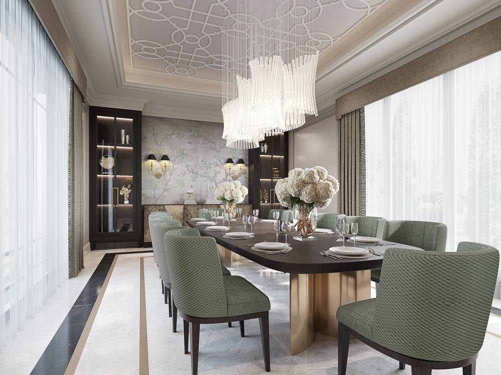 الأخضر هو لون الطبيعة والزرع، يرتبط بالاسترخاء والصحّة والطعام الصحّي، ويجمع بين بهجة الأصفر وهدوء الأزرق، ممّا يجعله الخيار المثالي لديكورات غرف الطعام، مع نصيحة المصمّمة بدمجه بالألوان الترابيّة، في إطار الديكور الحميمي. ورق الحائط الأخضر كفيل بجعل الغرف تبدو ذات تأثير عميق وهادئ، أمّا الكراسي المنجّدة بالأخضر أو حتّى الستائر فيساهمان في إعداد جلسة مريحة ومحفّزة للشهية.