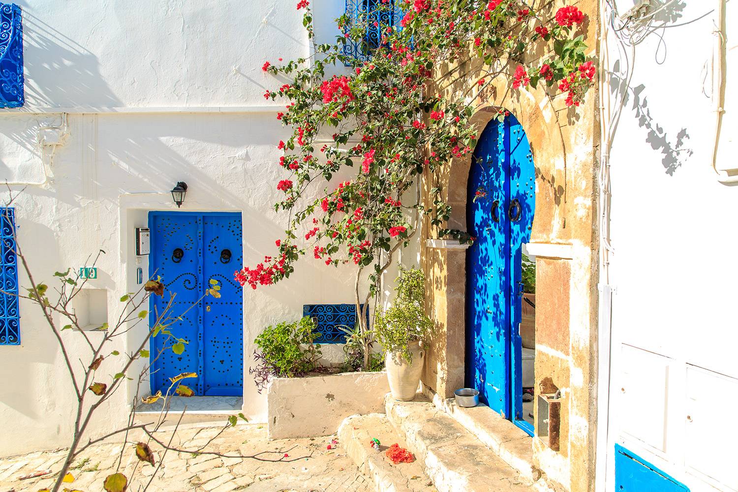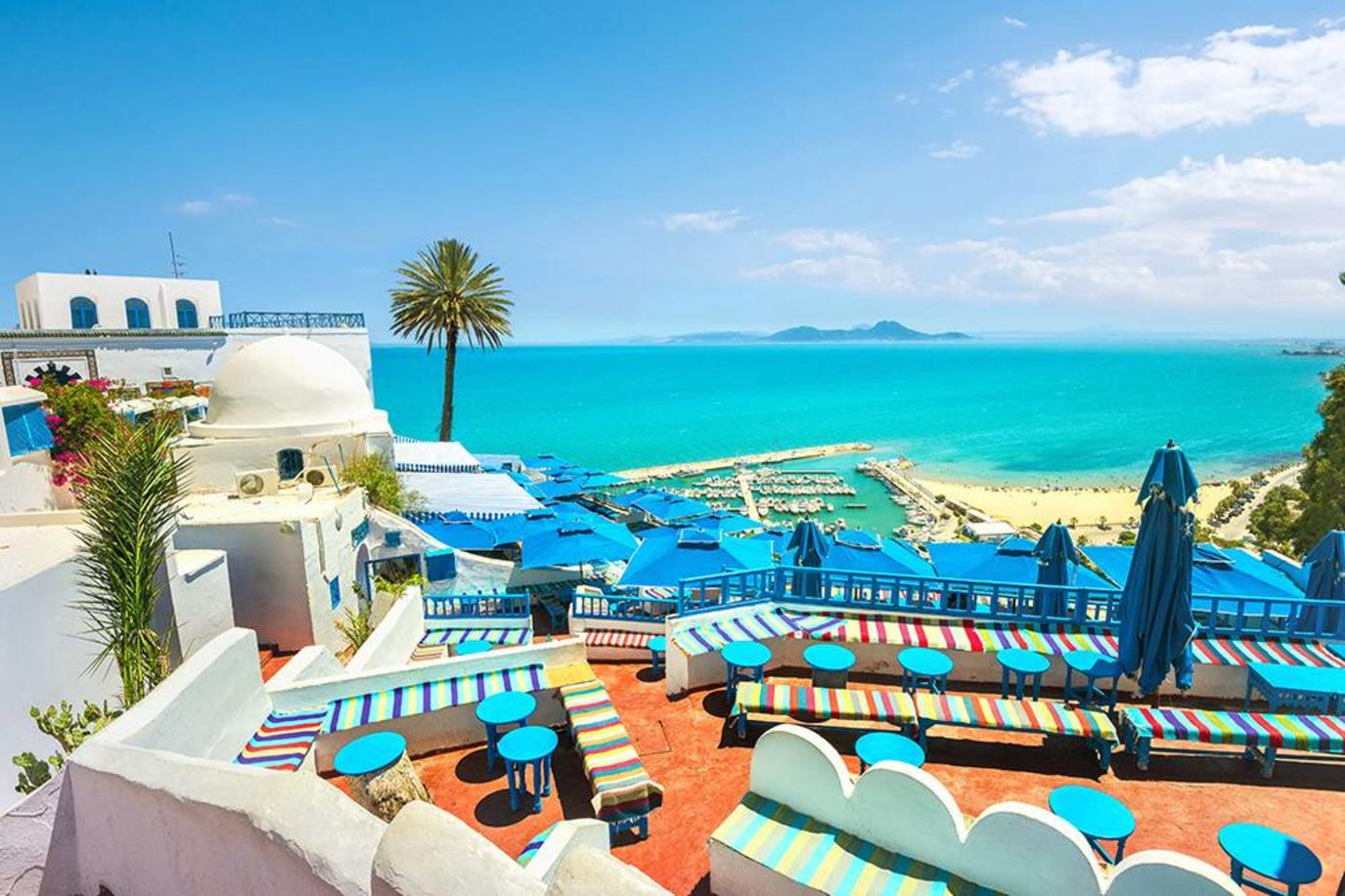 تزخر سيدي بو سعيد في تونس، ذات المناظر الخلابة، بالمباني البيضاء المثالية للصور مع النوافذ المصنوعة من الحديد المطاوع والأبواب الخشبية ذات اللون الأزرق السماوي.