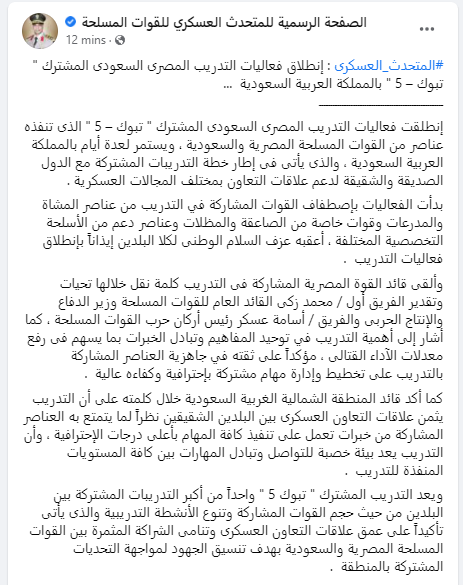 وفي موضوع متصل، قال بيانٍ للجيش المصري، إنه بدأ بتدريب مشترك "يستمر لعدة أيام بالسعودية مع القوات في المملكة"، وبدأ بـ"اصطفاف قوات من عناصر المشاة والمدرعات والصاعقة والمظلات وعناصر دعم من الأسلحة التخصصية المختلفة (لم يسمها)".