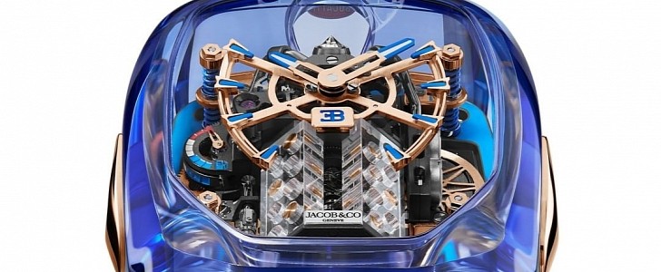 ساعة "بوجاتي شيرون بلو سافاير كريستال" هي نتاج تعاون لمدة عام بين "جاكوب أند كو" وبوجاتي، عملاقة صناعة السيارات الفرنسية، التي تصغر محرك بوجاتي 16 أسطوانة كي يتلاءم مع ساعة المعصم.