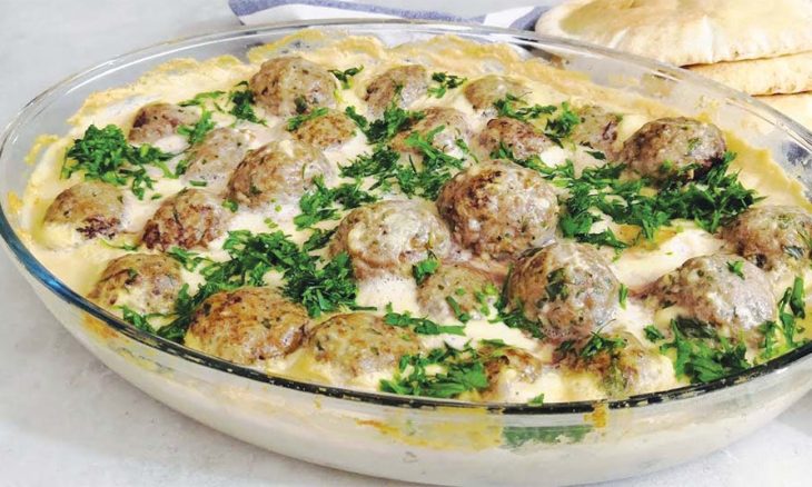 نوضع الطبق في الفرن المسخّن مسبقاً، حتى تنضج الكفتة تماماً وتتسبك الصلصة. نخرجه ونزيينه بالبقدونس المفروم والصنوبر المقلي، ونقدمه مع الأرز.