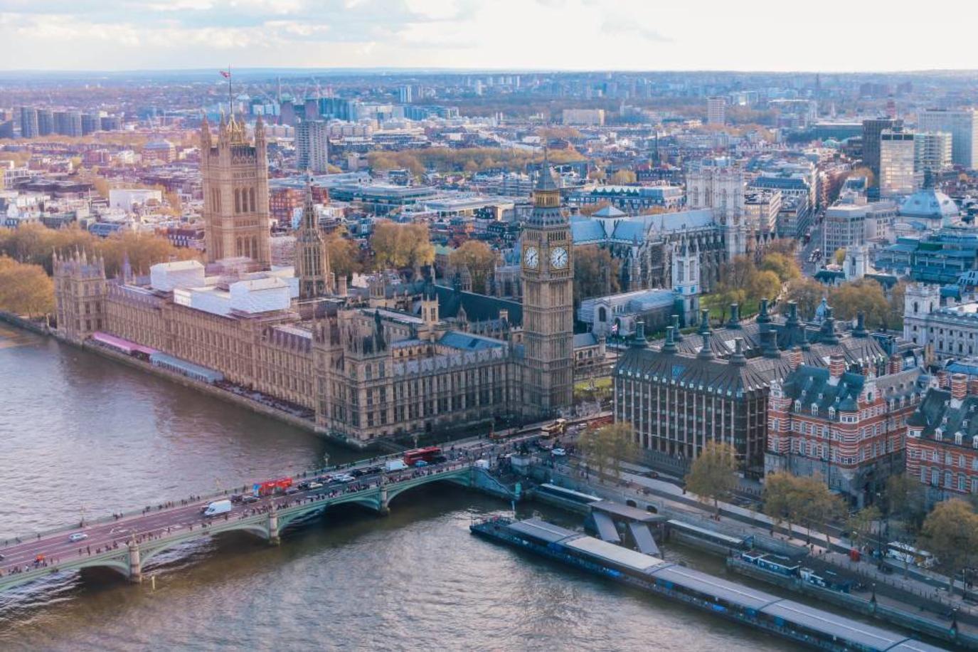 تدور عين لندن فوق نهر التايمز مقابل مجلسي البرلمان وبيج بن.