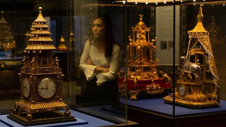 تعرض الساعات أنماطًا مختلفة وحرفية رائعة وقيمتها الفنية تجعلها ثمينة جدًا، ويُمكن بسهولة رؤية إحدى الساعات التي تجذب أكبر قدر من الاهتمام على اليسار عند دخولك الغرفة، إنها ساعة رنين صنعت خلال عهد أسرة تشينغ حوالي عام 1797 بواسطة صانعي الساعات الملكيين ويبلغ ارتفاع الساعة 5.85 متر وتقف على قاعدة مربعة ارتفاعها 3.6 متر.