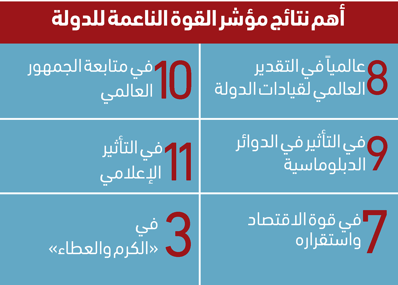 ونجحت دولة الإمارات في تحقيق تقدم كبير في الترتيب العام للمؤشر، ما مكّنها من دخول قائمة الدول العشر الأولى لأول مرة، متفوقة على العديد من دول العالم الكبرى والمتقدمة، كما ابتعدت الإمارات بالصدارة الإقليمية للمؤشر لترسخ مكانتها كأقوى دول منطقة الشرق الأوسط وشمال أفريقيا من حيث القوة الناعمة وقوة التأثير.