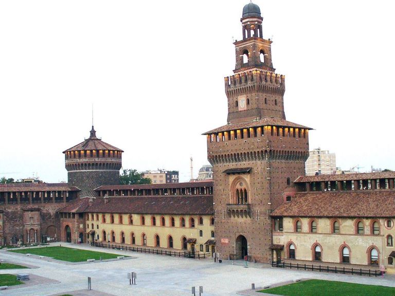 تنزه على طول جدران قلعة سفورزيسكو واكتشف قلعة ومتحف ميلانو من القرن الخامس عشر.