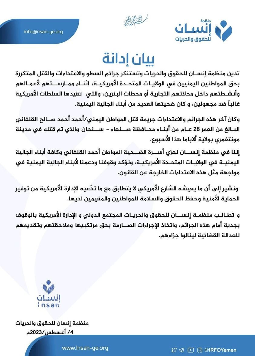 أدانت منظمة إنسان للحقوق والحريات جرائم السطو والاعتداءات والقتل المتكررة بحق المواطنين اليمنيين في أمريكا، أثناء ممارستهم لأعمالهم وأنشطتهم داخل محلاتهم التجارية وغيرها.