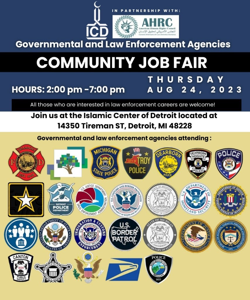 معرض )وظائف المجتمع( بدعوة من (ICD) والمجلس الامريكي لحقوق الانسان ، والتي تعتبر من اكبر الفعاليات التي يقوم بها المركز الاسلامي لخدمة المجتمع العربي الامريكي والمسلم في ديترويت وضواحيها ، حيث تقوم فكرة هذه الفعالية الرائدة والمتميزة في دعوة أكثر من 33 مؤسسة حكومية في ولاية ميتشغان الامريكية ، للمشاركة في هذا المعرض المفتوح وفتح الابواب واسعة أمام الشباب العربي الامريكي والمسلم ، للتقديم لهذه المؤسسات للعمل فيها ، وهذه خطوة في غاية الاهمية ، نظرا لأنها تشكل خطوة متقدمة للانخراط في العمل الحكومي امام شباب المجتمع العربي الامريكي بعد أن أغلقت هذه الابواب طويلا في وجهه باعذار كثيرة ومتعددة ، وفي حديث مع أ.سفيان نبهان المدير التنفيذي للمركز الاسلامي في ديترويت مع مجلة العربي الأمريكي اليوم وموقع الأمة برس واذاعة صوت اليمن ..صوت العربي الامريكي اليوم ، قال في اجابته على سؤالنا عن فكرة هذه الفعالية واهميتها : " فكرتها ببساطة تقوم على دعوة المؤسسات الامنية في الولاية والالتقاء بها ، لأننا شعرنا بضرورة اتاحة الفرصة كاملة أمام اشباب العربي الامريكي والمسلم للانخراط في السلك الأمني، لتقريب وجهات النظر بين العرب والمسلمون الامريكان ومع هذه المؤسسات الأمنية ، مما سيساعد على ازالة أي لبس أو سؤ فهم بين مجتمعنا العربي الامريكي وهذه المؤسسات الامنية المهمة من جهة ، ومن جهة أخرى تشجيع الشباب على الانخراط والانضمام الى هذه المؤسسات الحكومية كونهم مواطنون أمريكيون وهذا من حقهم القانوني والدستوري ، وثانيا ليكون للعرب والمسلمين الامريكيين حضور في هذه المؤسسات الأمنية مثلهم مثل غيرهم ، ليقوموا بخدمة مجتمعهم وتعريف الاخرين بتميزهم وقدرتهم على النجاح والتفوق أيضا.