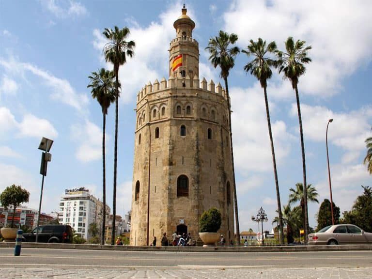 يُعد برج الذهب الواقع على الضفة اليسرى لنهر الوادي الكبير أحد رموز إشبيلية ويبلغ إرتفاعه حوالي 36 مترًا وكان هذا البرج مرتبط ببرج توري دي لا بلاتا مما يشكل جزءٍا مهمًا من الجدار الذي كان يحمي المدينة من هجمات القراصنة عن طريق البحر، ويضم البرج حاليًا متحف إشبيلية البحري الصغير ويتمتع بإطلالات ممتازة على المدينة والنهار من شرفته.3