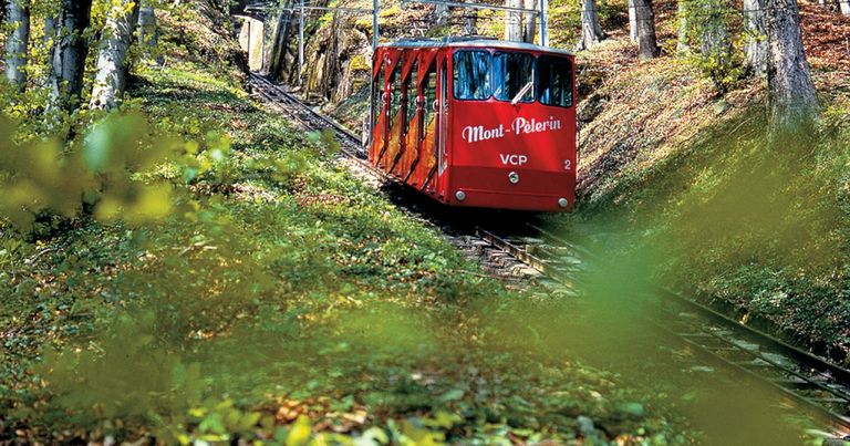 الوجهة النهائية هي "Mount Pèlerin" حيث توجد مجموعة واسعة من الخيارات للتنزه أو المشي لمسافات أطول أو الاستمتاع بمناظر بانورامية رائعة من المنصة المصممة لإمتاع السياح.