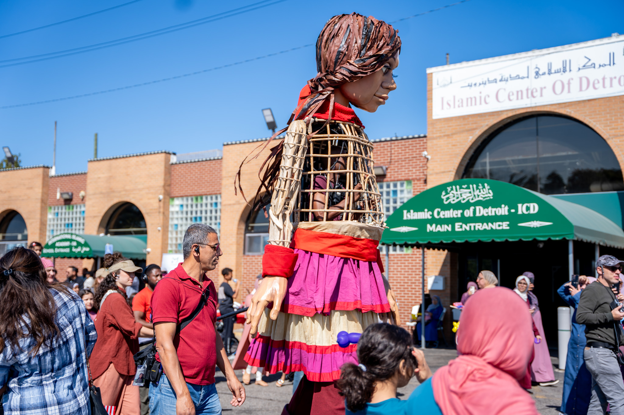 ديترويت - الأمة برس - إنها جائعة ومتعبة ووحيدة وضائعة. إنها خائفة ومرتبكة. هذه بعض أوصاف أمل الصغيرة -الدمية العملاقة التي تجسد شخصية فتاة سورية لاجئة، تبلغ من العمر 10 سنوات، تسافر حول العالم بحثا عن منزل يأويها وأناس تشعر بينهم بدفء الحياة.