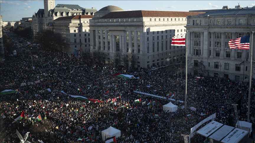 واشنطن - تظاهر عشرات الآلاف في واشنطن السبت، دعما لفلسطين وتنديدا بالهجمات الإسرائيلية المستمرة على قطاع غزة منذ 7 أكتوبر/ تشرين الأول الماضي.