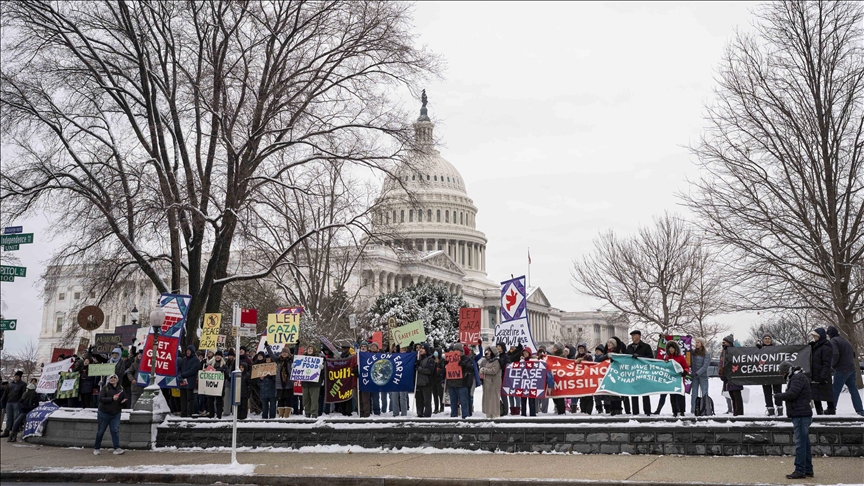 واشنطن - نظم نشطاء مجموعة "مينونايت أكشن" مظاهرة داخل مبنى الكونغرس الأمريكي، للمطالبة بوقف إطلاق النار في قطاع غزة الفلسطيني.