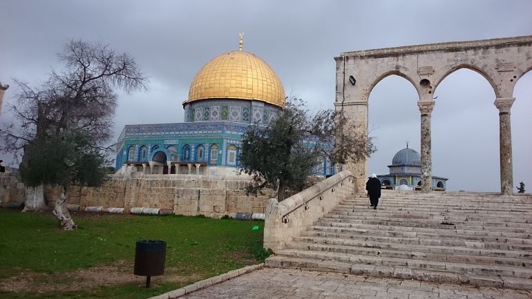 2- مسجد قبة الصخرة: وهو المسجدُ مثمّن الأضلاع ذو القبة الذهبية الشهيرة، وقد سبق ذكْرُ أنّ عبد الملك أمر بصبّ مئات آلاف الدنانير عليها، فكانت ذهبيّة فعلا لا مطلية بالذهب فحسب. ولئن كانت الجمعة لا تُقام في مسجد قبة الصخرة فإنه فيه كان "يُصلَّى.. العيدُ والاستسقاء" في العصر القديم؛ وفقا للعُليمي.