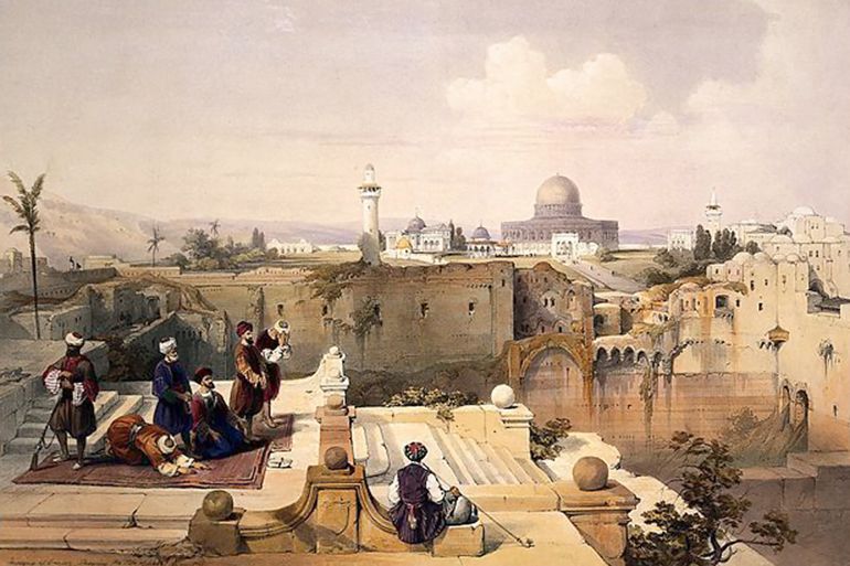 وقد ذكر المؤرخ الأديب الصفدي -في ‘الوافي بالوفيات‘- قصة بيتين شاع أمرهما بين الناس "لما خرب القدس"، وكأنهما قيلا على لسان هذه زهرة المدن الإسلامية بعد مكة والمدينة:
