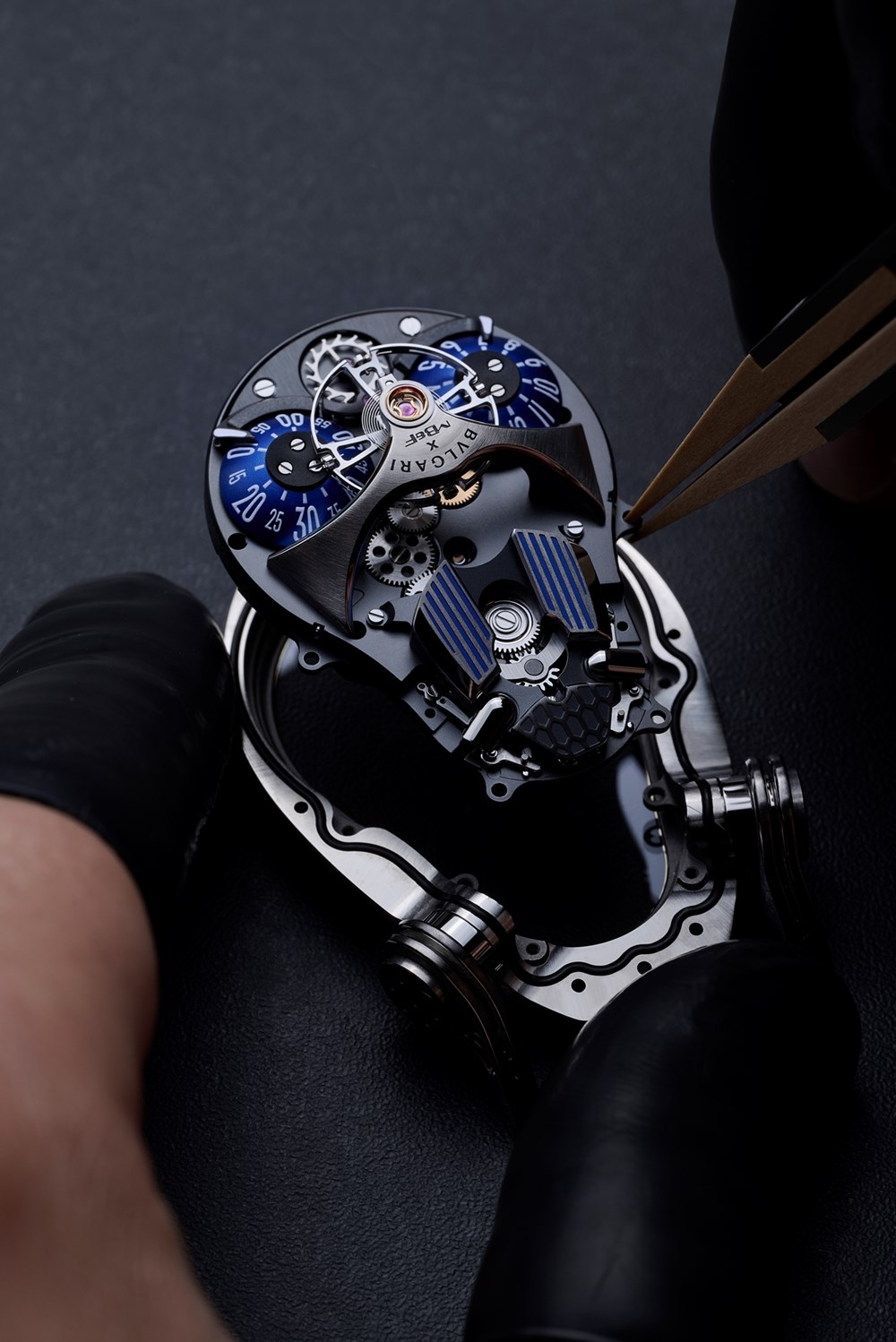 وتتطلب إعادة تصور «Serpenti» رمز الولادة الأبدية والتحول الجريء، في آلة قياس الساعات، إعادة تطوير كاملة لهذه القطعة التاريخية، ليس فقط من حيث الهندسة الميكانيكية وتصور الحركة، ولكن من حيث تصميم العلبة والتصنيع. وتمثل ساعة «Serpenti»، من «Bvlgari x MB&F»، إبداعاً فريداً، وُلد من لقاء مُلهم ورؤية مشتركة، حيث يعزز العيار والتصميم بعضهما بسلاسة.