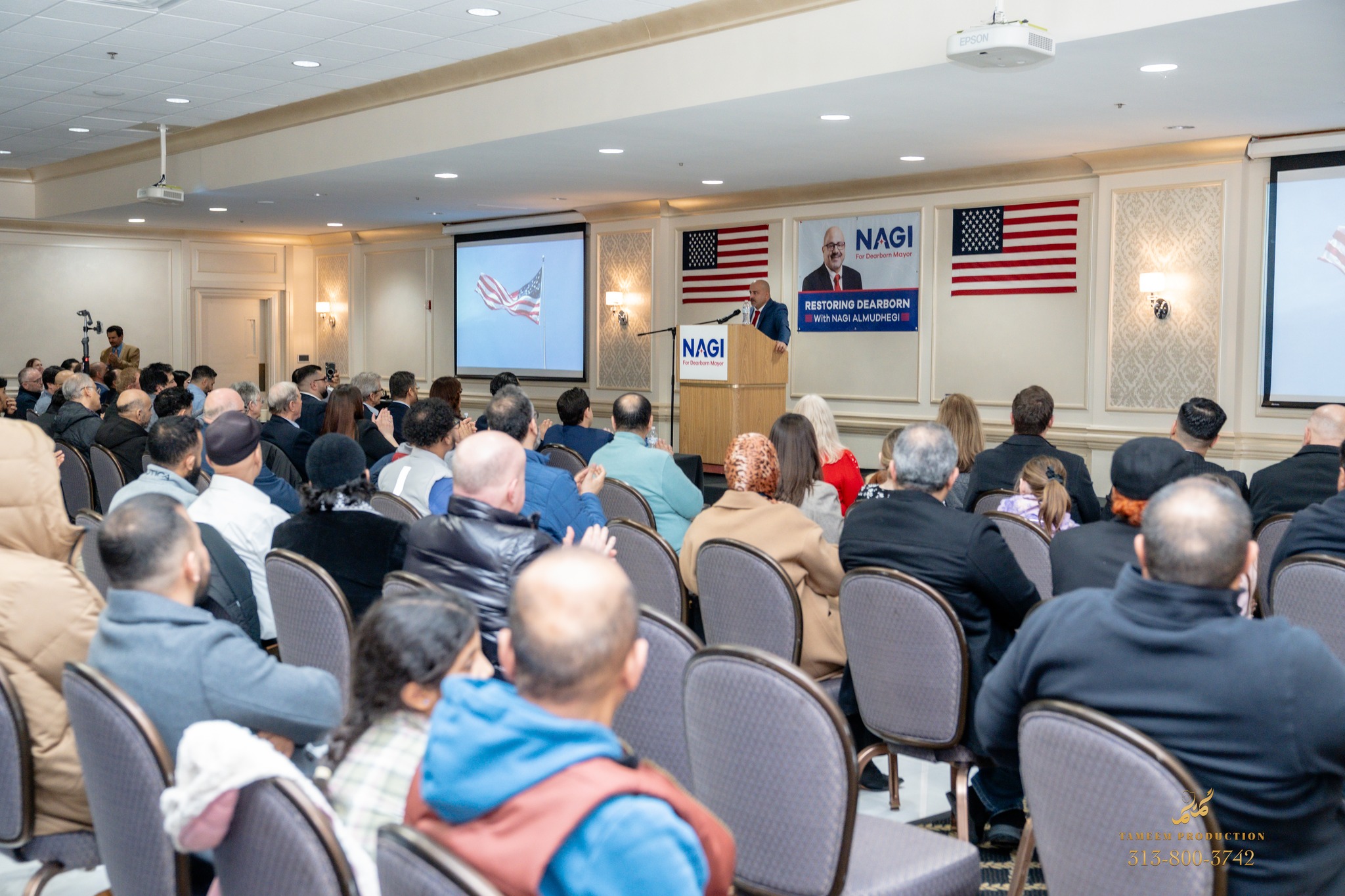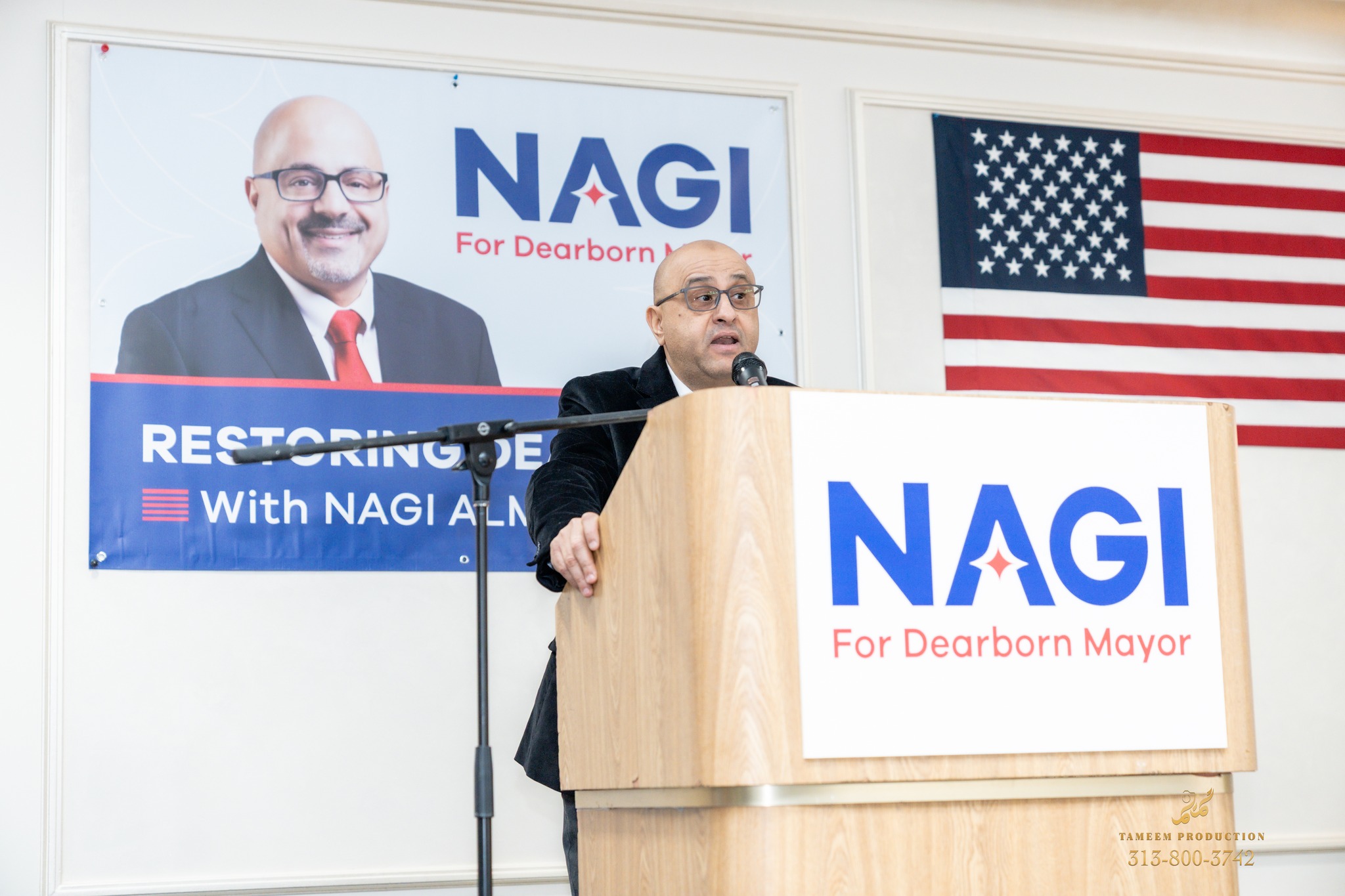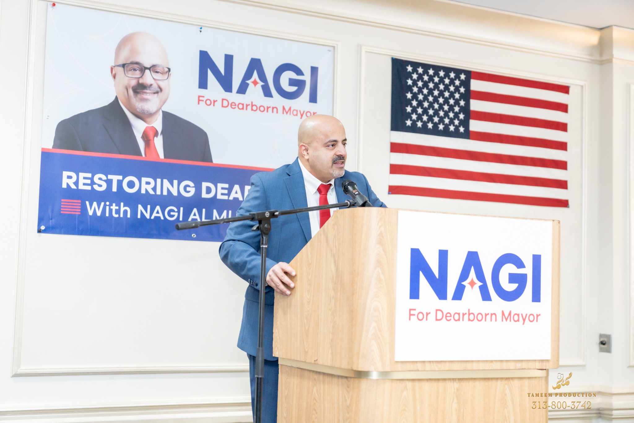 ديربورن - الأمة برس - محمد دهسان الدعيس - وسط حضور جماهيري كثيف اكتظت به قاعة نادي ڤرلين كلوب بمدينة ديربورن أعلن اليمني الأميركي المهندس ناجي المدحجي رسميا ترشحه لمنصب عمدة بلدية ديربورن ، حيث افتتح الحفل على أنغام الأغنية الوطنية “God Bless the USA” بينما زينت خلفه ملصقات تحمل العلم الأميركي وصورة المرشح .