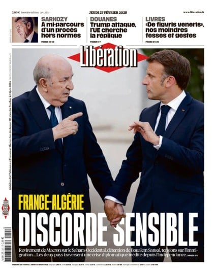 باريس- تصدّر موضوع التوتر الدبلوماسي الفرنسي- الجزائري الصفحة الأولى من عدد صحيفة “ليبراسيون” الفرنسية لهذا الخميس، مرفقًا بصورة معبّرة لرئيسي البلدين إيمانويل ماكرون وعبد المجيد تبون، وتحتها العنوان: “فرنسا- الجزائر.. الخلاف الحسّاس”.