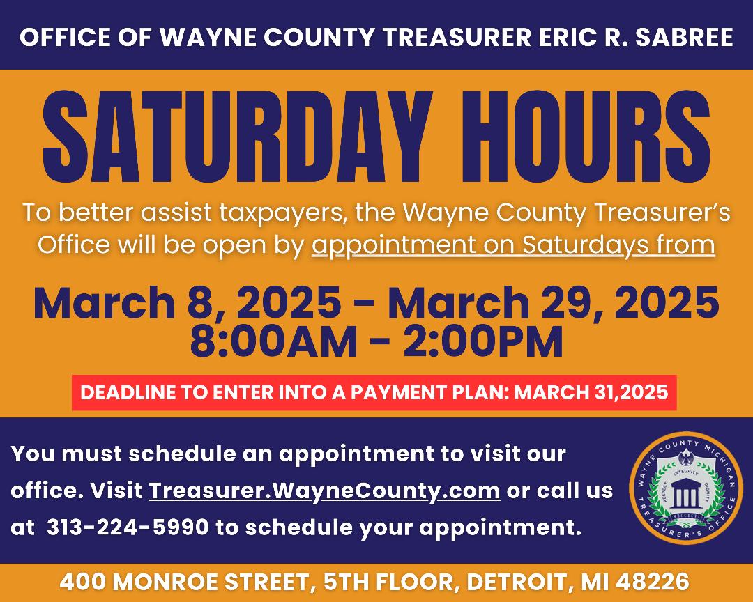 يمكن لدافعي الضرائب زيارة المكتب أيام السبت عن طريق الحجز المسبق فقط. لحجز موعد، يُمكنهم زيارة الموقع الإلكتروني www.treasurer.waynecounty.com أو الاتصال على الرقم :