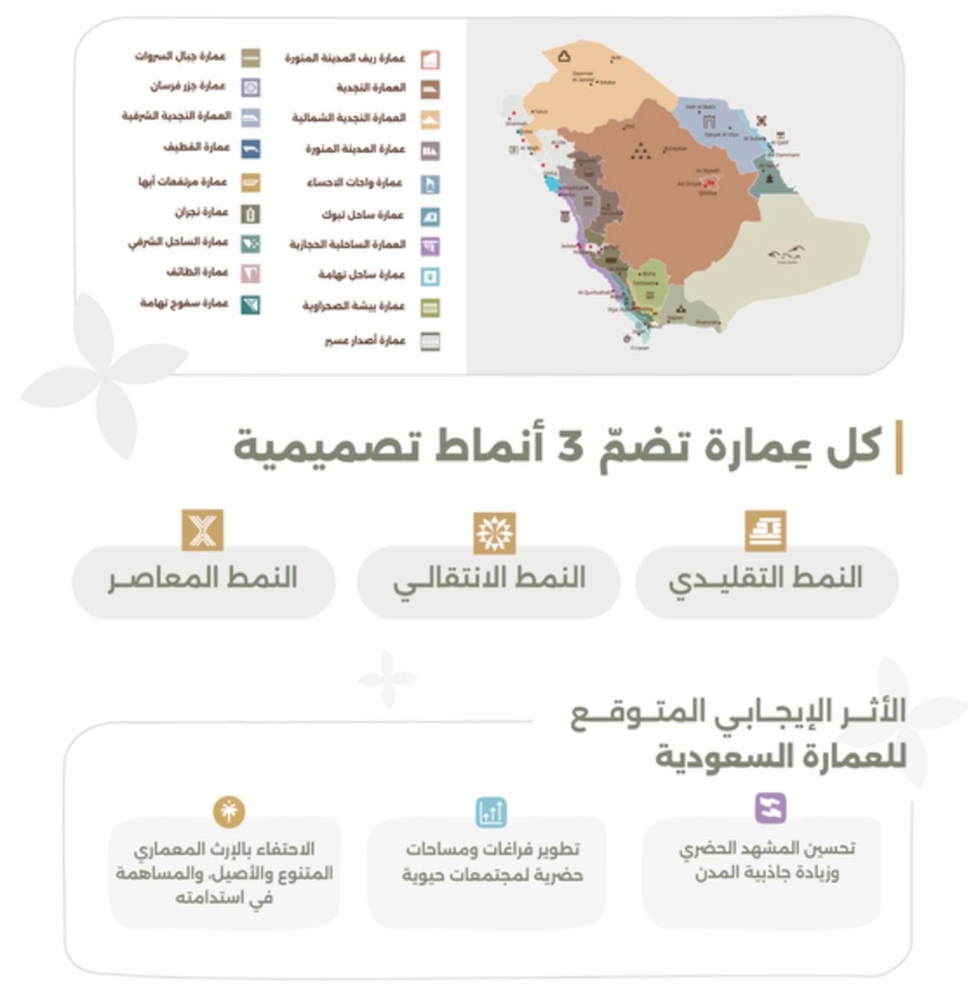 وأكد ولي العهد رئيس اللجنة العليا للموجهات التصميمية للعمارة السعودية، أن الخريطة تعكس تنوع البلاد الثقافي والجغرافي، وتأتي ضمن مساعي السعودية لتطوير مدن حضرية مستدامة تتناغم مع الطبيعة المحلية، وتوظف الطراز المعماري التقليدي بأساليب حديثة.