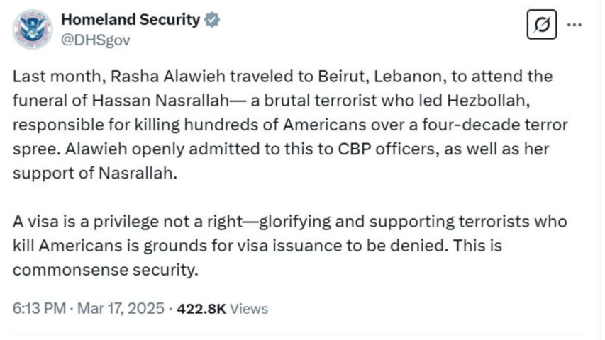 في منشور على "إكس"، أكدت وزارة الأمن الداخلي الأميركية التي تعنى بمراقبة الحدود والهجرة ومكافحة الإرهاب، ترحيل علوية.