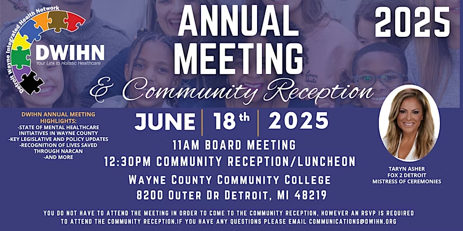 شبكة ديترويت واين المتكاملة للرعاية الصحية (DWIHN) هي أكبر نظام للصحة النفسية المجتمعية يُقدم رعاية صحية متكاملة في ميشيغان. من خلال برامج وخدمات تعتمد على أفضل الممارسات الواعدة، نعزز مجتمعًا داعمًا يحتضن الأشخاص المصابين بأمراض نفسية، وإعاقات ذهنية ونمائية، واضطرابات تعاطي المخدرات. نقدم المساعدة في مجال الصحة النفسية للرضع، والإسكان الداعم، والتعافي لدعم تقرير المصير، وتحسين الصحة والسلامة وجودة الحياة لما يقرب من 123,000 شخص وعائلاتهم. لمزيد من المعلومات، يُرجى تنزيل تطبيق myDWIHN للجوال، www.dwihn.org أو الاتصال بخط المساعدة المتاح على مدار الساعة طوال أيام الأسبوع،