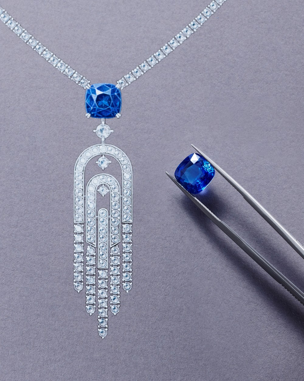 - مجموعة الياقوت الأزرق: تتميز بأحجار الياقوت السريلانكية الزرقاء بقصة الوسادة، مع إعادة تشكيل القوس؛ ليصبح قبة أنيقة، تُحاكي شلالاً من الألماس. وتُبرز أناقة التصميم بنية مرنة ومحكمة التفاصيل، لتزين قلادة من الذهب الأبيض، وأقراطاً ساحرة، وخاتماً بياقوت ملكي، يزيد وزنه عن 6 قراريط.