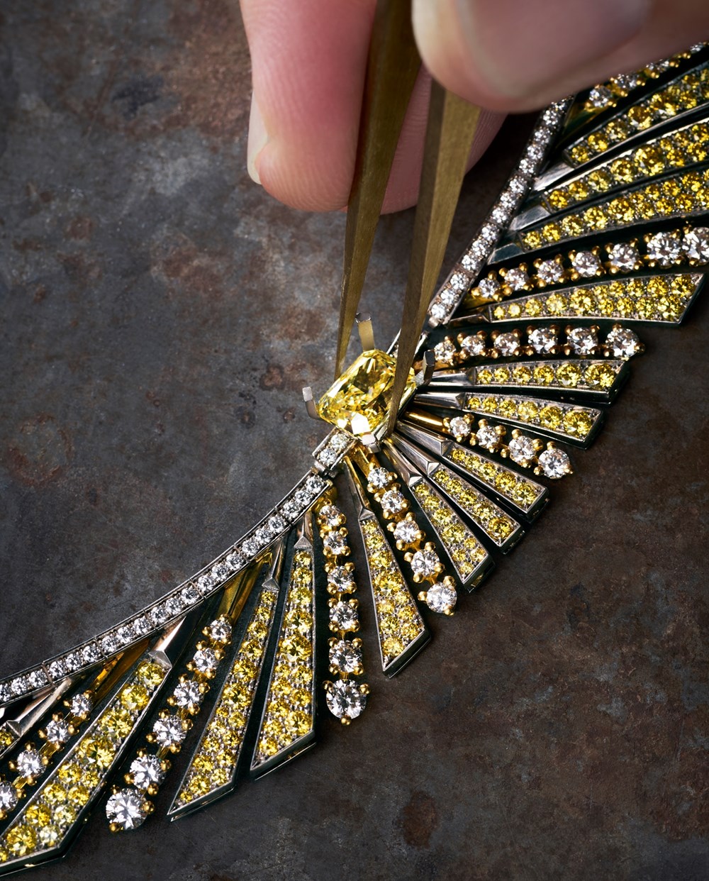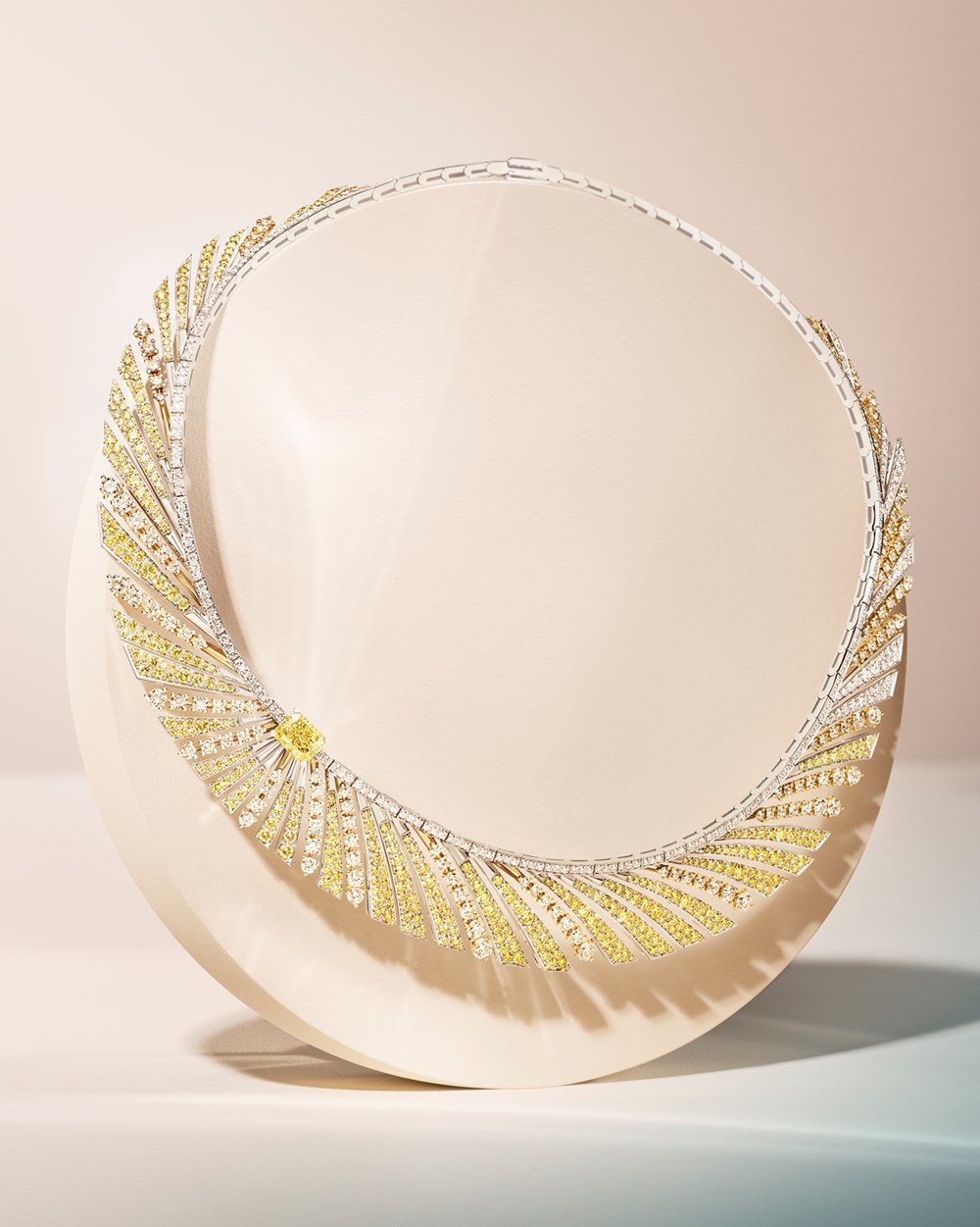قلادة «بزوغ الفجر»: تُجسد لحظة بزوغ الفجر، من خلال التلاعب بتدرجات الألماس الأصفر والأبيض. وتنسدل خيوطها برقة على الصدر، ويتربع في مركزها حجر ألماس أصفر بوزن قيراطين، متوهجاً بلونه العميق، ومعبراً عن فخامة مجموعة «Soleil d'Or» الأسطورية.